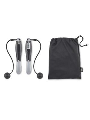 JUMPY Cuerda saltar sin cablesCuerda de saltar digital ajustable en bolsa de RPET. Muestra en el display de LCD el numero de saltos, la distancia saltada y las calorías quemadas.