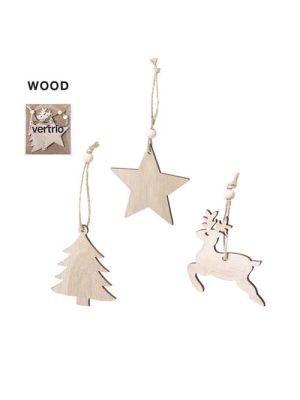 Set Adornos TilmexSet de 3 figuras navideñas de línea nature para colgar, fabricadas en madera de tacto suave. Cordón en yute con bolita para ajuste. Incluye reno, estrella y árbol de navidad. Presentado en bolsa individual con cartón interior en color natural.