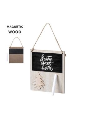 Adorno CarriganAdorno de navidad de línea nature, con pizarra y original diseño troquelado de árbol de navidad, fabricado en madera de tacto suave. Parte trasera imantada y cordón para colgar en yute. Incluye tiza para escribir. Presentada en bolsa individual.Desde 0,58 € /ud