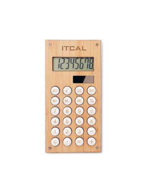 CALCUBAM Calculadora bambú de 8 dígitosCalculadora de 8 dígitos en ABS con estuche de bambú. Batería LR1131 incluida. Funciona con pila y carga solar.