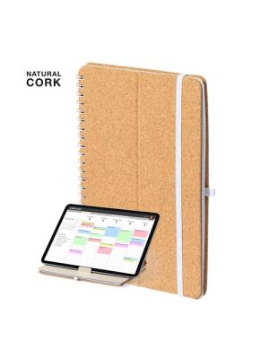 Libreta soporte de anillas de línea nature. Tapas rígidas fabricadas en corcho natural, con original soporte en caña de trigo para smartphone y tablet. Incluye elástico de cierre y soporte para bolígrafo en color blanco. 70 hojas interiores con disposición a una raya. Presentada en bolsa individual de diseño.
