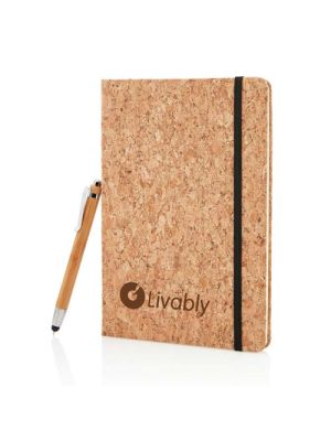 Libreta ECO de corcho natural con 160 páginas de 80 grs. Página divisoria en negro y banda elástica negra. Incluye bolígrafo de bambú con punta touch y roller.