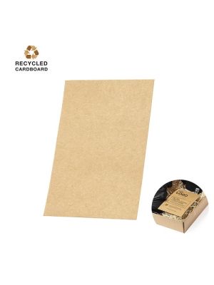 Libreta con tapas fabricadas en cartón reciclado y acabado cosido a juego en el lomo. Interior con 60 hojas blancas lisas. Presentado en bolsa individual reciclada.