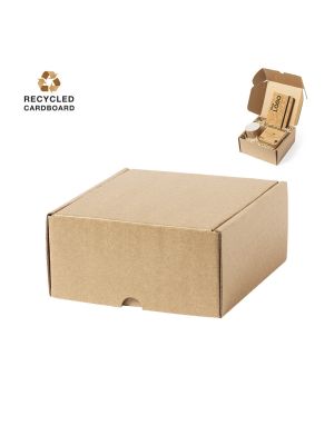 Caja de presentación tamaño S, fabricada en cartón reciclado corrugado y acabado kraft. En línea con la tendencia del mercado hacia la sostenibilidad integral del regalo, ofreciendo soluciones de origen reciclado con el fin de ayudar a la mejora y conservación de nuestro planeta.