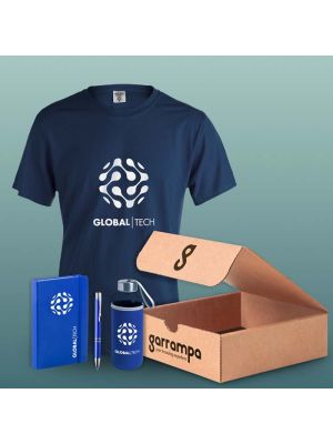 Welcome pack básico presentado en cajaContiene botella de agua, libreta, bolígrafo, camiseta y caja de regalo. Todos los productos se pueden personalizar. Los productos del pack se pueden cambiar por otros si lo desea,