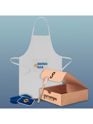 Welcome pack de cocina presentado en cajaContiene juego de manoplas, delantal, cuchara de cocina y caja de regalo. Todos los productos se pueden personalizar. Los productos del pack se pueden cambiar por otros si lo desea.