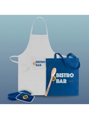Welcome pack de cocina presentado en bolsaContiene juego de manoplas, delantal, cuchara de cocina y bolsa. Todos los productos se pueden personalizar. Los productos del pack se pueden cambiar por otros si lo desea.