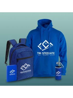 Welcome pack con sudadera y mochilaContiene sudadera, libreta, botella de agua de cristal y mochila. Todos los productos se pueden personalizar. Los productos del pack se pueden cambiar por otros si lo desea.