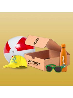 Welcome pack Verano presentado en cajaContiene pelota de playa, gorra, gafas de sol, botella de agua y caja de regalo. Todos los productos se pueden personalizar. Los productos del pack se pueden cambiar por otros si lo desea.
