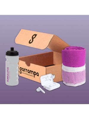 Welcome pack wellness presentado en cajaContiene botella de agua deportiva, auriculares inalámbricos, toalla de deporte y caja de regalo. Todos los productos se pueden personalizar. Los productos del pack se pueden cambiar por otros si lo desea.