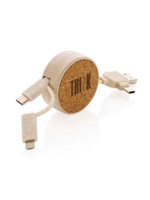 Cable retráctil de diseño único que te permite cargar cualquier tipo de artículo desde cualquier tipo de fuente USB. Hecho de corcho y paja de trigo (35%) mezclado con ABS y cable TPE sin PVC. Debido a la entrada tipo C, el cable es perfecto para cargadores de teléfonos de nueva generación y ordenadores macbook que solo tienen salida tipo C. El cable también tiene una entrada USB A normal. Salida: tipo C y conector de doble cara para dispositivos IOS y Android. Longitud máxima del cable: 100 cm. Artículo 100% libre de PVC.