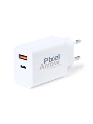 Cargador USB de pared con carga rápida, fabricado en resistente ABS. Salida USB y Tipo C. Enchufe europeo y presentado en atractiva caja individual de diseño.