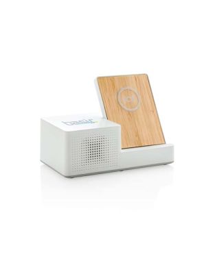 Actualiza tu escritorio con este cargador inalámbrico súper conveniente. Hecho de ABS y madera de bambú 100% natural, este cargador inalámbrico con altavoz se integra perfectamente en tu escritorio o sala de estar. El cargador inalámbrico es un cargador de 5W y viene con un cable micro USB de 150 cm para conectarlo a tu fuente de alimentación USB. El altavoz inalámbrico de 3W te permite transmitir música a una distancia de hasta 10 metros utilizando BT 4.1. Al usar ambas funciones, se recomienda mantener el dispositivo conectado a una fuente de alimentación. Incluye 2 puertos USB para cargar via USB (5V1A max). Carga inalámbrica compatible con todos los dispositivos habilitados para QI, como la última generación de Android, iPhone 8 y posteriores. Diseño Registrado®