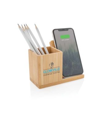 Cargador organizador inalámbrico 15W fabricado en bambú. Con función soporte para smartphone y compartimentos extra para objetos, compatible con dispositivos equipados con tecnología de carga inalámbrica. Amplia superficie de marcaje y presentado en caja individual de diseño kraft. Disponible manual de instrucciones en español e inglés..Materiales como el bambú fomentan la utilización de materias primas naturales, reduciendo las emisiones contaminantes. Proviene de una planta de gran resistencia y versatilidad, con crecimiento y regeneración rápidos, siendo una excelente alternativa al uso de madera tradicional..Fabricado conforme a los estándares RoHS y en cumplimiento con los siguientes requisitos de seguridad:.Sistema de protección contra sobrecalentamiento..Sistema de protección contra sobrecarga..Sistema de bloqueo para evitar cortocircuitos.
