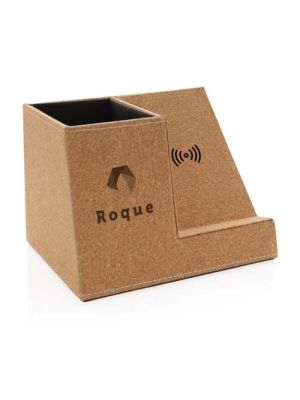 Cargador organizador inalámbrico de línea nature. Hecho en corcho natural y compatible con dispositivos equipados con tecnología de carga inalámbrica. Indicador de estado de carga y cable USB incluido. Amplia superficie de marcaje, con bandeja troquelada y presentado en atractiva caja de diseño eco.