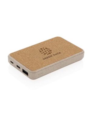 Powerbank de bolsillo de 5000 mah. La parte superior está hecha de corcho natural y el cuerpo está hecho de 35% de paja de trigo mezclado con ABS. Cuando esté completamente cargado, te proporcionará suficiente energía para recargar tu teléfono móvil hasta tres veces. El powerbank contiene una batería de polímero de litio de alta densidad de 5.000 mAh de grado A de larga duración. Los indicadores de energía indicarán el nivel de energía restante para que siempre sepas cuándo recargar. Entrada tipo C 5V/2A Entrada micro USB 5V/2A. Salida 5V/2A. Artículo y accesorios 100% libre de PVC.