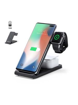 Completo cargador inalámbrico 15W con soporte para gadgets. Diseñado para la carga simultánea del smartphone, auriculares y smartwatch: una estación de carga todo en uno, versátil y plegable. Presentado en atractiva caja individual de diseño.