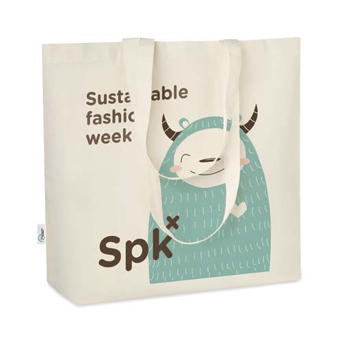 Descripción | Bolsa de la compra de algodón de comercio justo con asas largas. 140 gr/m². |