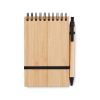 Descripción | Libreta A6 con tapa de bambú con 70 hojas rayadas de papel reciclado. Incluye un bolígrafo reciclado a juego con punta y clip de PLA. Tinta azul. |
